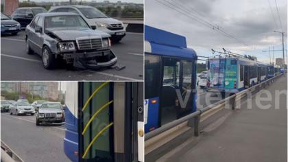 Traficul rutier este dat peste cap pe Viaductul din Chișinău, după producerea unui accident în care au fost implicate un automobil de marca Mercedes și un troleibuz.