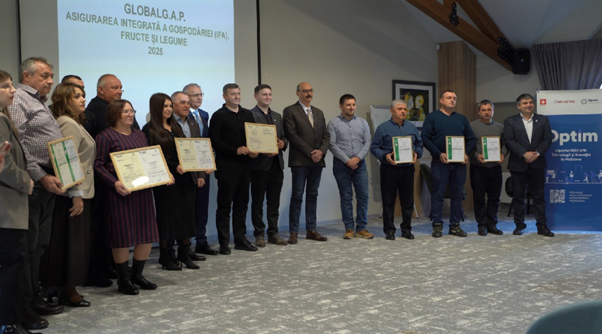 Nouă producători mici și mijlocii de struguri de masă din raioanele Cahul și Taraclia au obținut certificarea internațională GLOBALG.A.P., în cadrul unei ceremonii organizate de Asociația Moldova Fruct, cu susținerea Elveției și a organizației Helvetas Moldova. Certificarea a fost acordată după finalizarea unui program de instruire, mentorat și pregătire tehnică derulat pe parcursul anului 2025,… Continuă lectura Nouă producători din Cahul și Taraclia au obținut certificarea GLOBALG.A.P. pentru struguri de masă