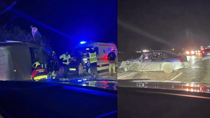 (foto) Un microbuz s-a răsturnat la Bardar, după ce s-a lovit violent cu o mașină: Pompierii și ambulanța, la fața locului